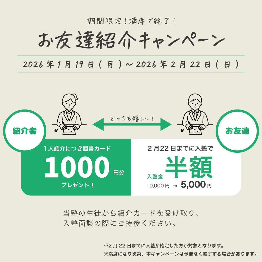 当塾の生徒から紹介カードを受け取り、面談の際に提出していただくと入塾金が半額となるキャンペーンです!